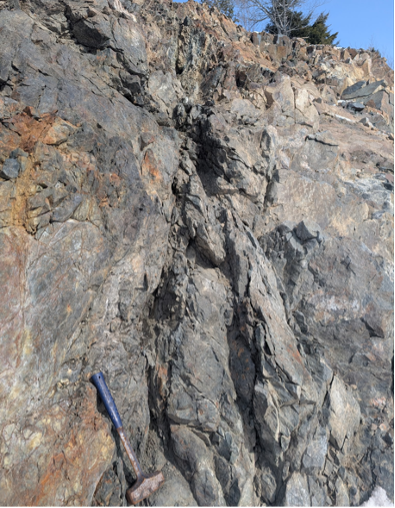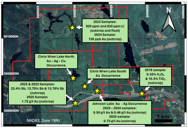 Rock sampling was also conducted in the area of the Johnson Lake gold – silver mineral occurrence (New Brunswick Department of Natural Resources and Energy Development, Mineral Occurrence Database, Reference No. 1304), also located within the south-central region of the Glenelg Property. A 2025 grab sample collected from an outcrop exposure in this area returned a highly anomalous value of 0.733 g/t gold. This represented further confirmation of gold mineralization in the area of this reported mineral occurrence. Rock grab samples collected from outcrop at this site during 2023 and 2024 returned highly anomalous values for gold (0.501 g/t and 0.462 g/t) (see Company news releases of November 30, 2023). This outcrop is altered and pyrite bearing.