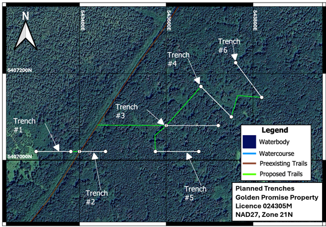 Golden Promise Mines Inc. is a wholly owned subsidiary of GR has conducted exploration programs for gold during 2025 within multiple mineral licences at the 100% owned Golden Promise Property. The work to date has included trenching (southwest region – see Great Atlantic news release of September 4, 2025), prospecting, rock – soil geochemical sampling, and magnetometer geophysics. Exploration is continuing at multiple licences at Golden Promise. Trenching is also planned during 2025 in a target area in the southwest region of the property in an area northwest-north of the gold-bearing Linda – Snow White showing (a gold-bearing quartz vein system) pending receipt of required permits. Prospecting and rock geochemical sampling were conducted at the adjacent East Golden Promise Property and Southwest Golden Promise Property, both 100% owned by Golden Promise Mines Inc. Analytical results are pending for 2025 samples (rock and soil) submitted to date.