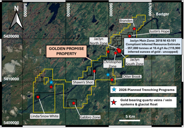Trenching is planned within the southwest and east-central regions of the Golden Promise Property. Golden Promise has received approvals from the Newfoundland and Labrador government for the planned trenches.