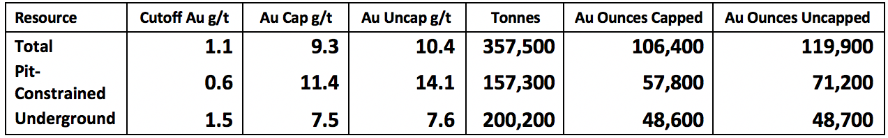 Because part of the vein is near surface the resource estimate was constrained by a conceptual open pit to demonstrate reasonable prospects of eventual economic extraction. Generic mining costs of US$2.50/tonne and processing costs of US$25.00/tonne were used together with a gold price of US$1,300/ounce. A conceptual pit slope of 45° was assumed with no allowance for mining loss or dilution. Based on the combined hypothetical mining and processing costs and the assumed price of gold, a pit-constrained cutoff grade of 0.6 g/t was adopted. For the underground portion of the resource a cutoff of 1.5 g/t was assumed. The cutoff grade for the total resource is the weighted average of the pit-constrained and underground cutoff grades.