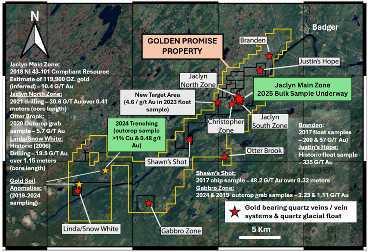 The Golden Promise Property hosts gold bearing quartz veins in various regions of the property including the Jaclyn Zone quartz vein systems, Shawn’s Shot quartz vein, Otter Brook occurrence, Linda / Snow White quartz vein system and the Gabbro Zone occurrence. The Jaclyn Main Zone is the most advanced of the gold bearing vein systems.