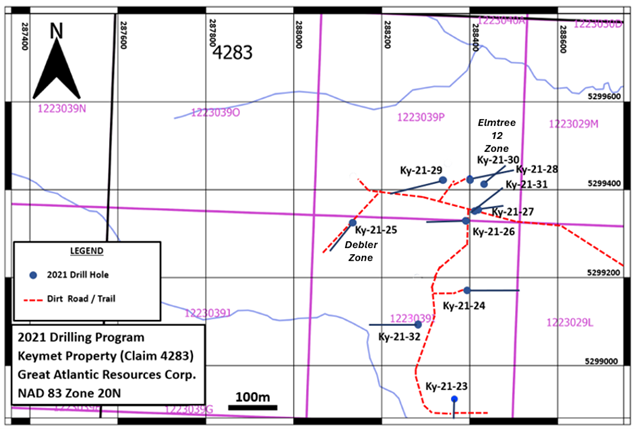 The 2021 diamond drilling program was conducted in the area of the Elmtree 12 polymetallic vein system (northwest of the historic Keymet Mine), which hosts high grade silver, zinc and copper. Gold mineralization also occurs locally in this area associated with arsenopyrite.