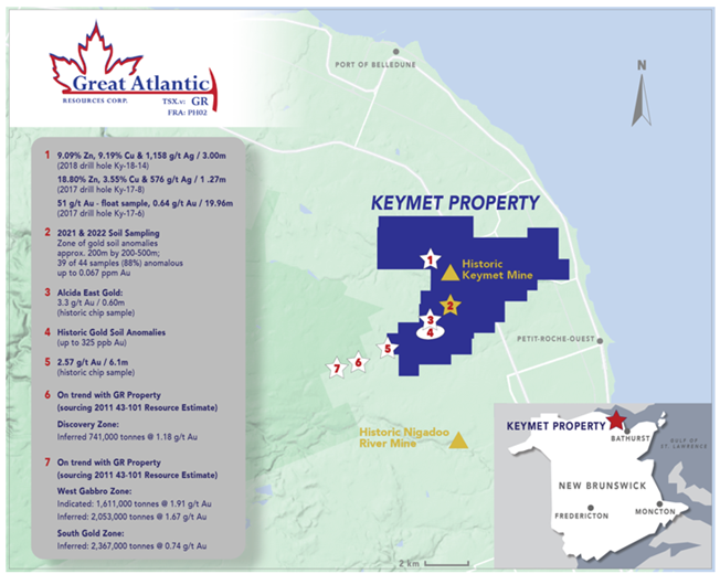 The Keymet Property hosts the historic Keymet Base Metal – Silver Mine which operated briefly during the 1950s. The mine burnt in the mid 1950s and was never recapitalized. The Keymet Property is located approximately four kilometers north of the historic Nigadoo Mine. The Nigadoo Mine operated during the 1960s and 1970s producing copper, lead, zinc and silver.