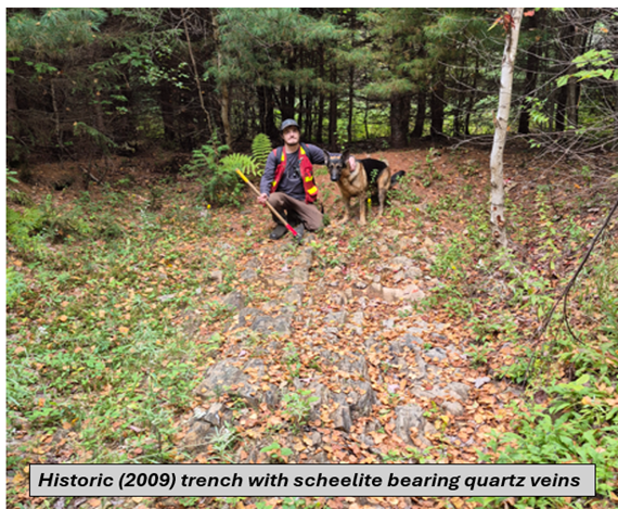 The Flume Ridge claim hosts the Flume Ridge Tungsten mineral occurrence with scheelite reported in quartz veins (New Brunswick Department of Natural Resources and Energy Development, Mineral Occurrence Database, Reference No. 1448). Two 2009 drill holes within the southern region of the claim were reported to intersect 0.608% tungsten (0.76% WO3) over 0.57 meters (core length) and 0.557% tungsten (0.70% WO3) over 0.65 meters core length. Four 2009 trenches – stripped areas were reported to expose tungsten (scheelite) bearing quartz veins. A bedrock grab sample reported during 2018 from one of these trenches was reported to return 1.58% tungsten (1.99% WO3). A float boulder sample reported during 2020 from the southern region of the claim was reported to return 1.66% tungsten (2.09% WO3).