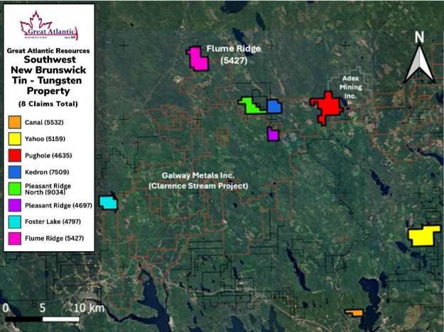 The Flume Ridge mineral claim is one of eight mineral claims located in southwest New Brunswick, the claims comprising the Southwest New Brunswick Tin – Tungsten Property. These mineral claims were acquired by Great Atlantic through a purchase agreement (see Company news release of March 7, 2025).